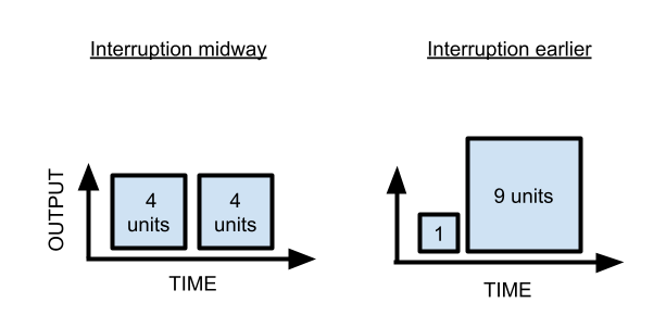 A different model where interruptions are super costly is any situation where there’s a startup cost for getting into the task in the first place. For example, imagine a task where it takes you an hour to get started and then your output is linear, two units of output per hour.