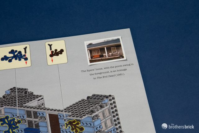 Throughout the manuals there are bits of trivia about the show relating to the portion of the set you’re building. It’s a bit surprising to see overt references to classic horror movies like The Evil Dead in a LEGO set, but I’m not going to complain.