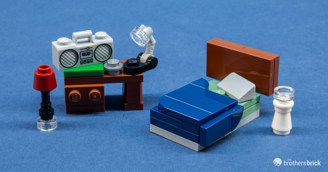 And speaking of things that are more likely to be found in a fan model than in an official set, check out this furniture that adorns Will’s room. The bed with its turned back cover and askew pillow is the best LEGO bed I’ve seen yet.