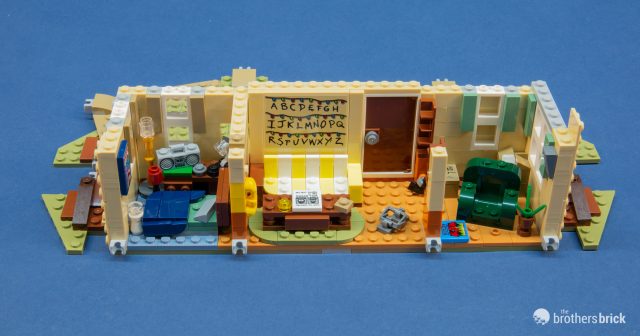 Once all the walls are complete, you can get a good look at the interior before the roof is attached. The layout of the rooms doesn’t reflect the real geography of the home, but it captures the key locations and nails the aesthetic, from the awful olive green rug and striped couch to the overstuffed sofa chair. The infamous wall of lights is a large sticker applied across a tan 6×6 tile on the wall.