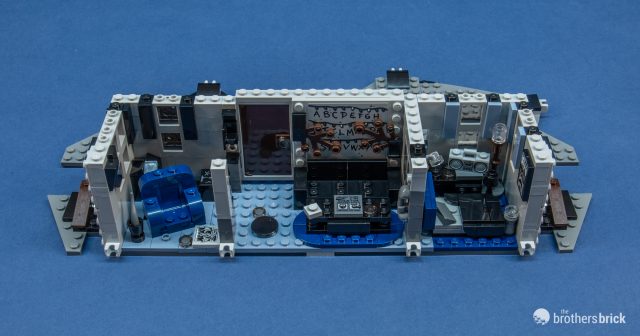 Inside, all the decor springs to life. The coffee table has a flyer for Will, and the walls have various stickered decorations. The nod to Jaws with the Shark poster in Will’s room is definitely a great addition to the lineup of LEGO spoof movies. The scenes are a mashup of the different seasons, with the wall of lights from season 1 and the traps from season 2. The beartrap on the floor is made with a pair of bucket handles.