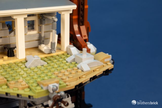 Hopper’s Blazer doesn’t just sit on the base, it actually attaches to a Technic pin in the yard’s rock landscaping. The other rocks are strategically placed to keep the vehicle from spinning; once attached, it moves very little even when turned upside down.