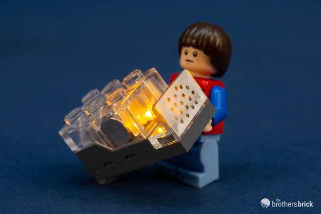 The light wall in the normal living room employs a standard 2×3 light brick with a yellow LED, but it’s filtered through one of the few printed pieces in the set, a clear 1×2 panel with a random dot pattern.