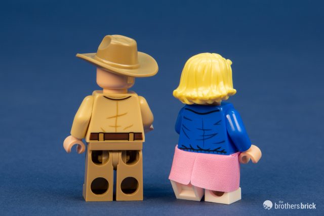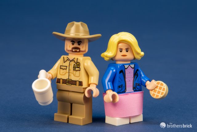 Next up are Police Chief Jim Hopper and Eleven. Eleven sports the blonde wig she wore in season 1 to cover her shaved head. It seems a bit of a miss to not include a very short hair piece for her real hair. She also has a pink cloth skirt of the same design found in several other sets. Hopper has a plain uniform but oddly doesn’t come with a gun. Eleven carries an Eggo waffle, letting us all finally have the right pieces to LEGO my Eggo! Both have great printing on the back as well, but neither has an alternate expression.