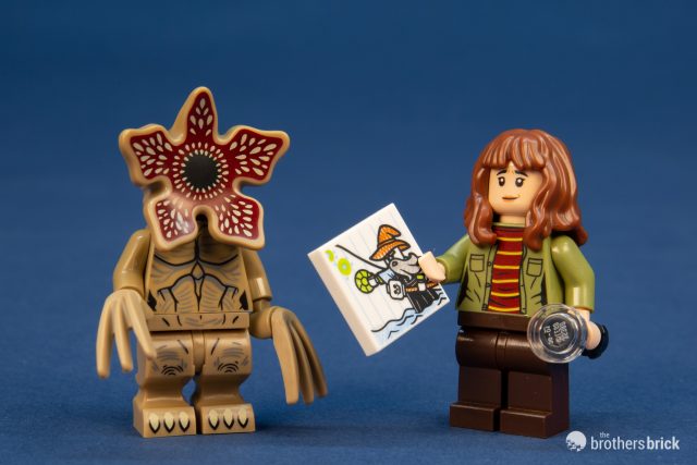 Finally, there’s Joyce Byers and the Demogorgon. Joyce has an olive green coat and the long brown hair introduced with Hermione last year. She carries a page of Will’s drawings (nicely LEGO-ified) and a flashlight. The Demogorgon is all dark tan, with printed digitigrade legs and a pair of Wolverine claws. The head is, of course, a new element that’s a helmet that sits over a traditional minifigure head.
