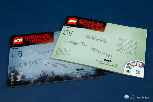 The two instruction manuals and two stickers sheets are in their own sealed bag, keeping the stickers nicely flat. Both the manuals and the stickers are divided by world; manual 1 and the first sticker sheet tackle the Blazer and the real Byers’ house, while the second of each is for the Upside Down. The manuals are designed as classified files from Hawkins National Laboratory, the government facility that’s the source of all the weirdness.