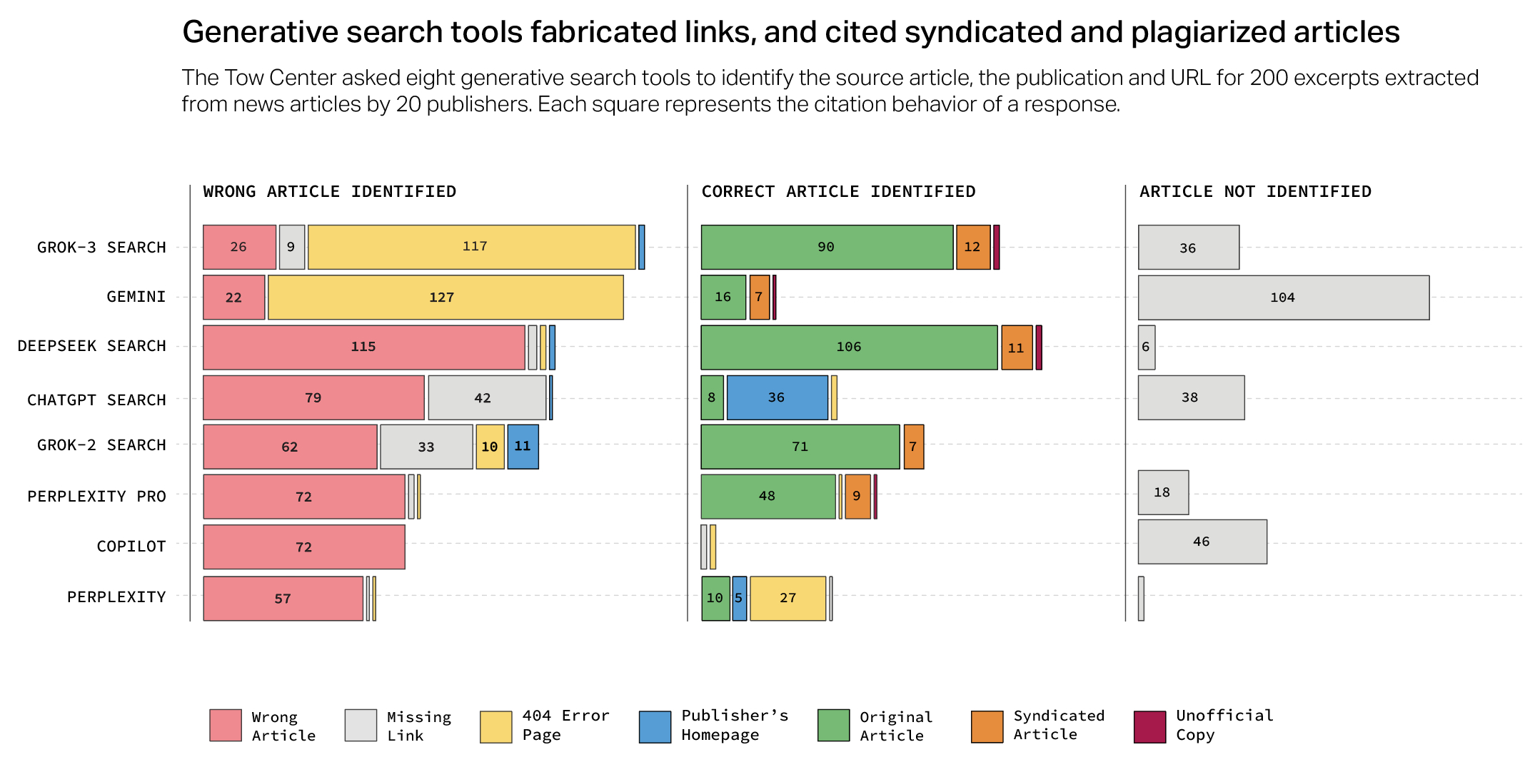 Meanwhile, generative search tools’ tendency to fabricate URLs can also affect users’ ability to verify information sources. Grok 2, for instance, was prone to linking to the homepage of the publishing outlet rather than specific articles.