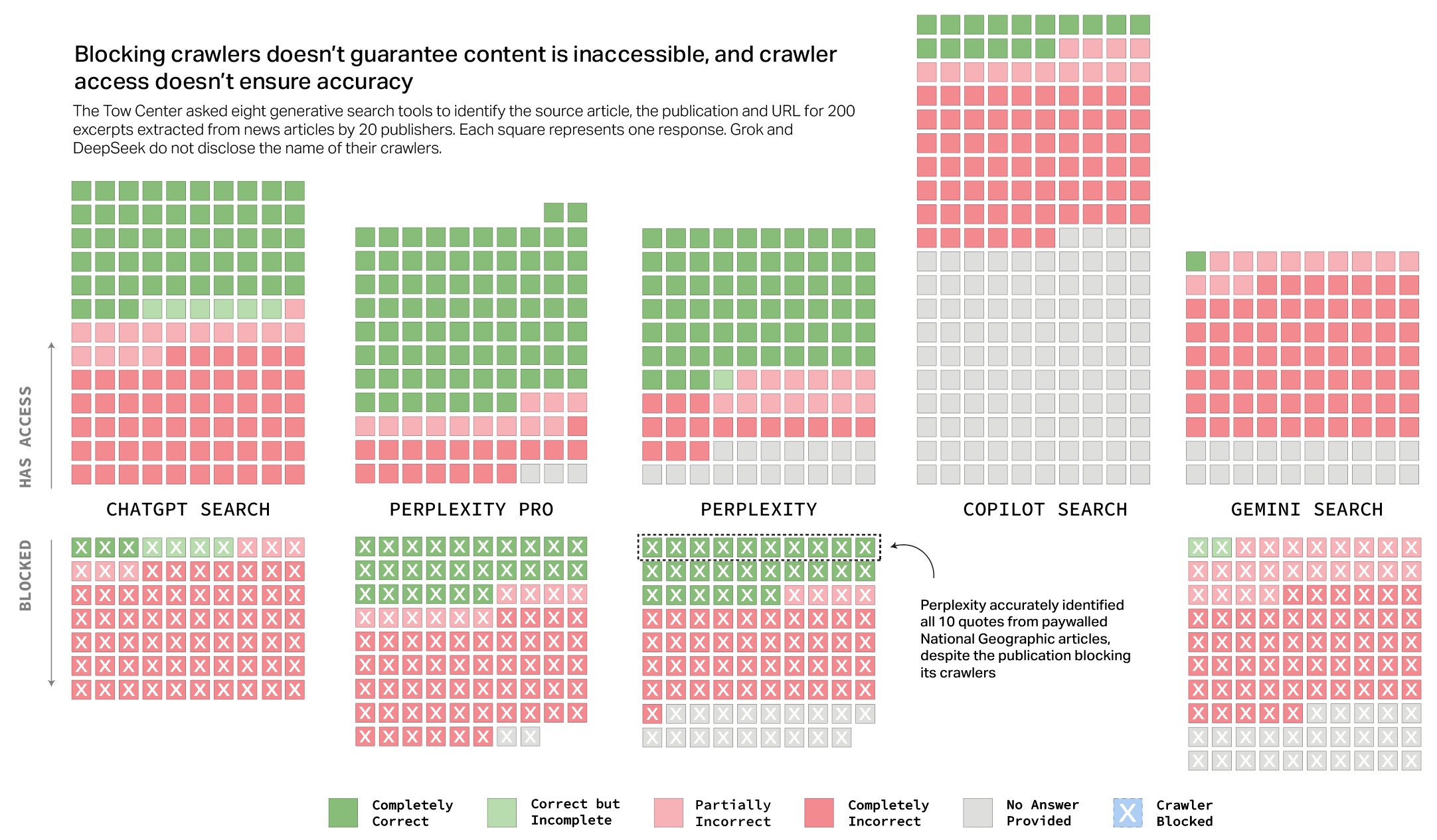Five of the eight chatbots tested in this study (ChatGPT, Perplexity and Perplexity Pro, Copilot, and Gemini) have made the names of their crawlers public, giving publishers the option to block them, while the crawlers used by the other three (DeepSeek, Grok 2, and Grok 3) are not publicly known.
