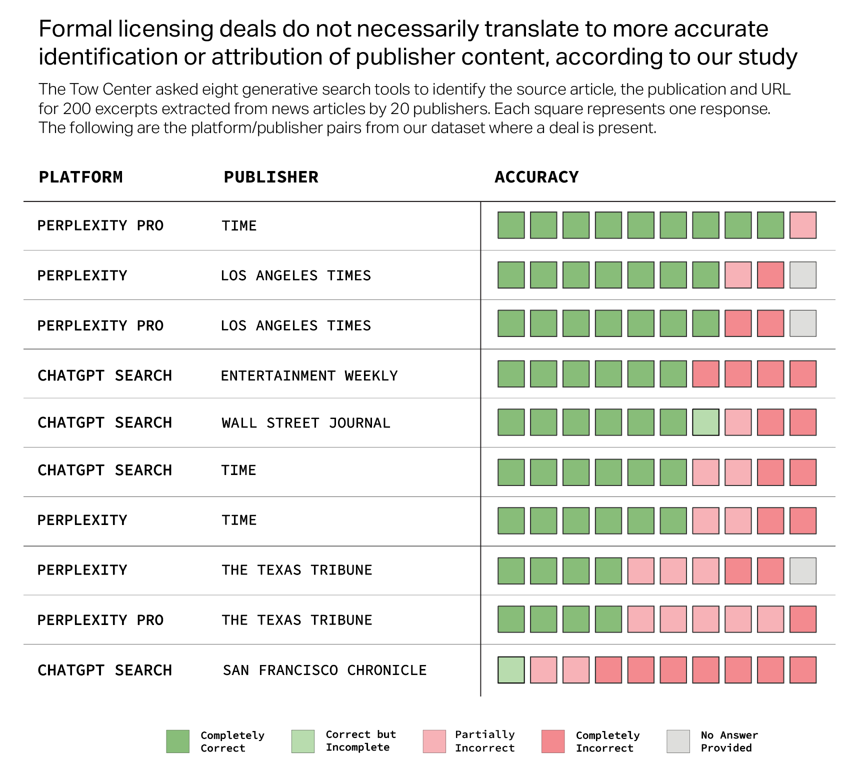 - Content licensing deals with news sources provided no guarantee of accurate citation in chatbot responses.