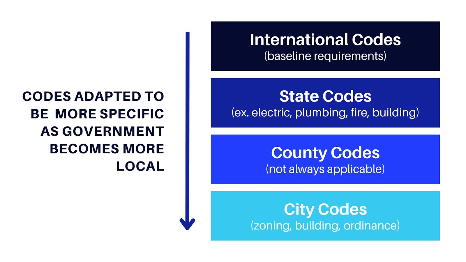And city codes are complex. They have to be. They constantly evolve to enhance safety, respond to environmental changes, and meet the needs of unique communities. Regulations are set at multiple levels of government - international, state, county, and city - with each layer further refining and adapting standards to address local priorities. In practice, this means cities can modify county or state codes to be more specific, such as limiting residential buildings to three stories for aesthetic reasons. But cities will also refrain from making changes to county, state or international codes that they agree with. For example, most cities will fully adopt state-level electrical codes (which in turn are adjusted from international codes).