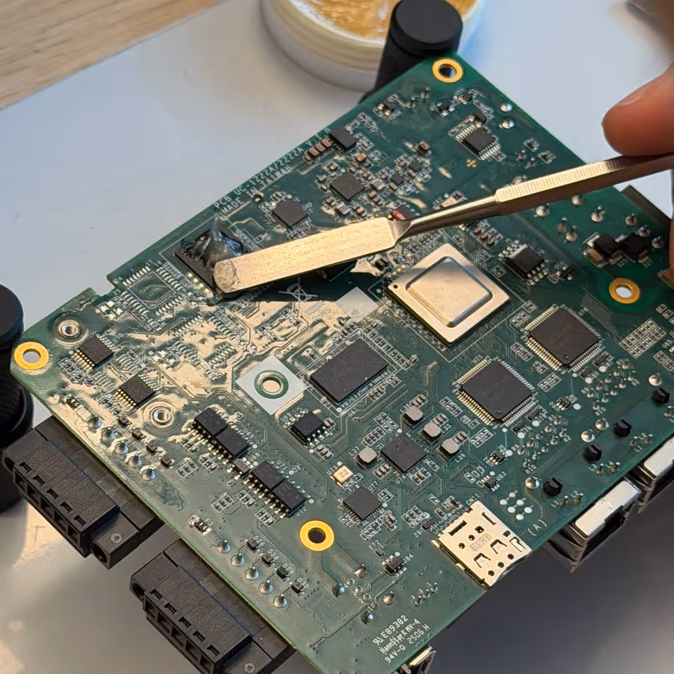 Soldering flux is applied to the eMMC flash chip.