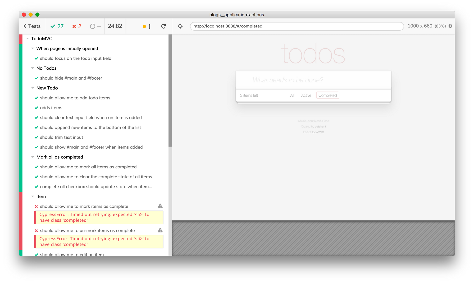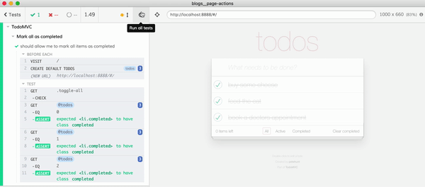 - The tests become much faster. Even the simple TodoMVC tests running locally against Cypress’s Electron browser went from 34 seconds to 17 seconds after switching from going through the user interface to using application actions - a 50% speed up.