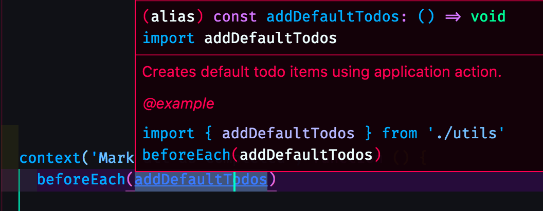 In the above example we are using the const ALL_ITEMS = '.todo-list li' selector in multiple tests. I even prefer to create a local utility function allItems to return all list items rather than share a selector constant.