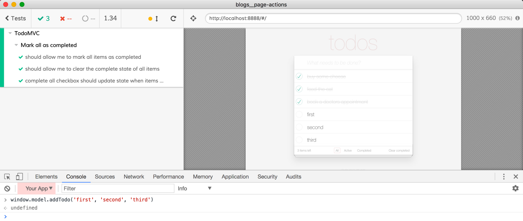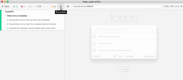 The above tests show how each selector is private to the specific block of tests. For example the selector const NEW_TODO = '.new-todo' is private to the block of tests "New Todo", and the selector const TOGGLE_ALL = '.toggle-all' is private to the block of tests "Mark all as completed". Other tests do not need to know the selectors for the page elements to add items or mark all completed - the tests can use app actions instead.