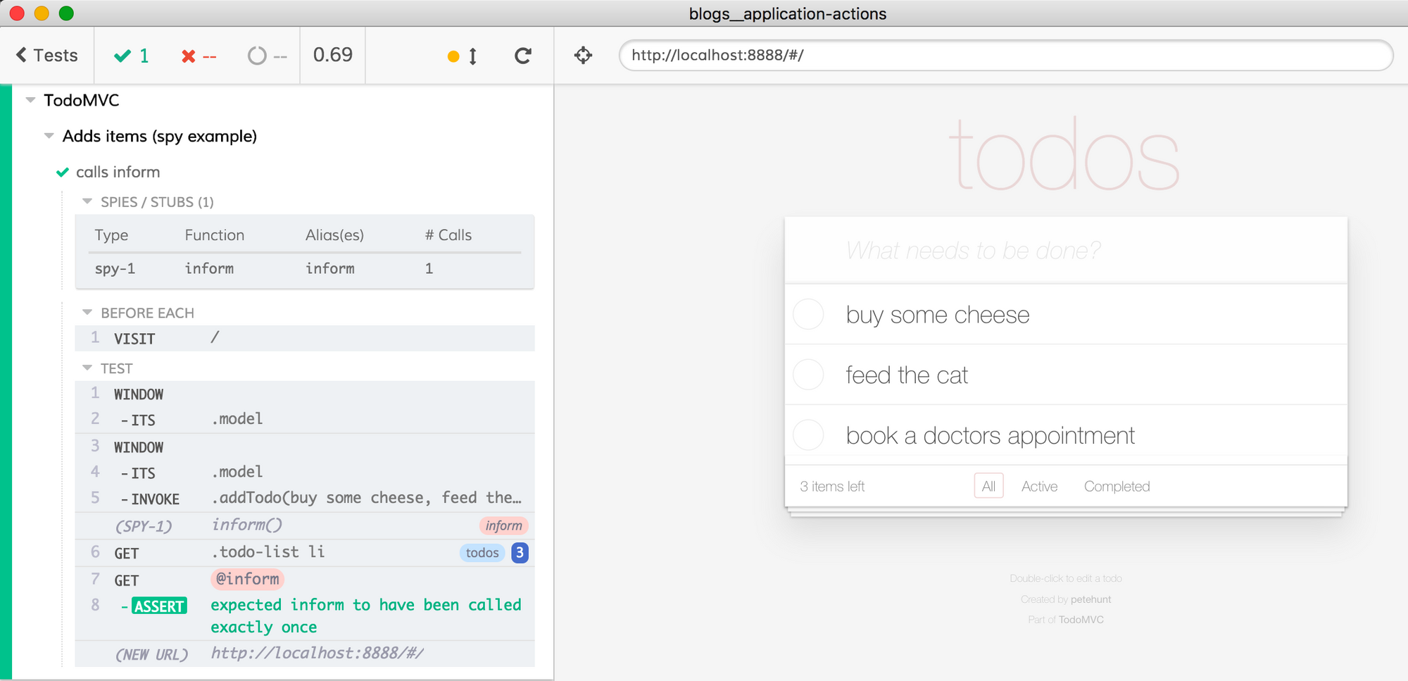 Even better - we can spy on methods directly in our application! Since our application calls model.inform when it is done updating the state, that’s a good sign that we can call another app action.