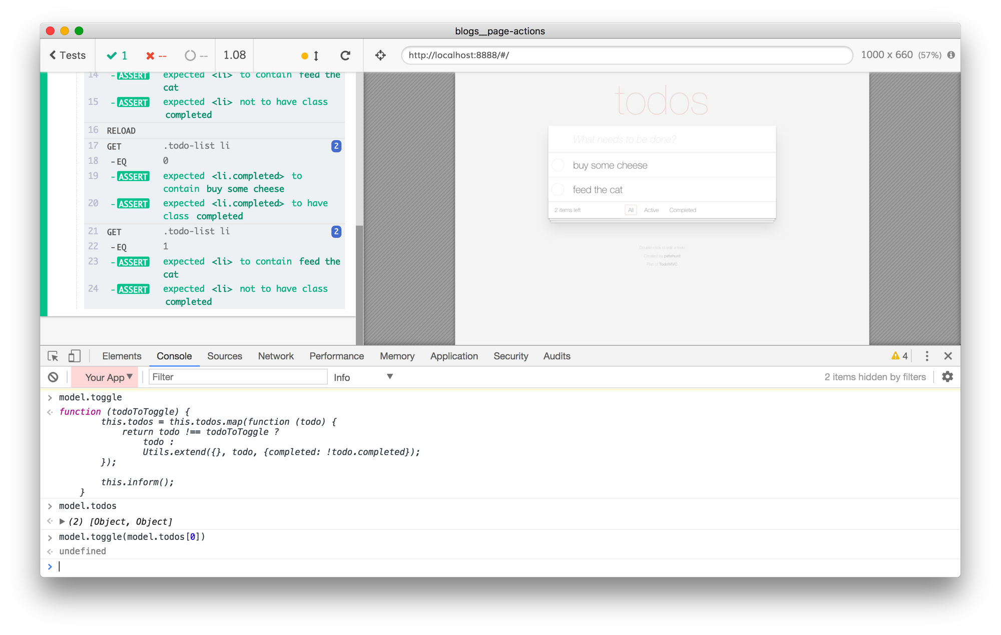 By using app actions to drive the application, we moved away from the way a user would use our application. Users would not be able to toggle an item before an item is shown to the user on the page. Thus our tests need to wait for items to appear in the UI before executing toggle(1). Again a simple reusable function should be enough.