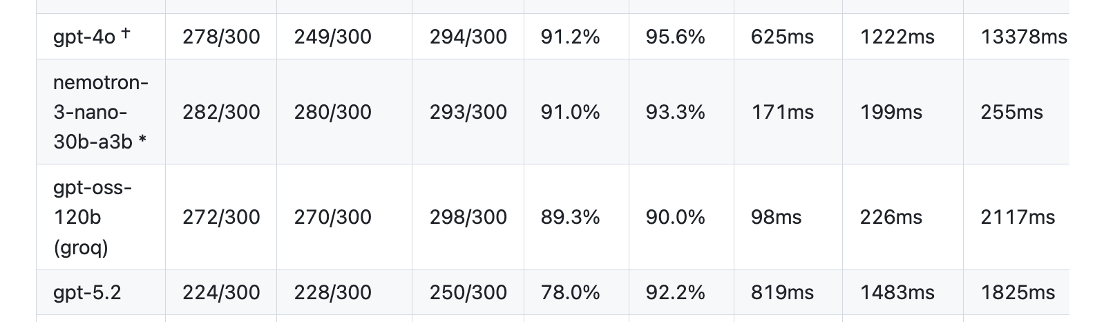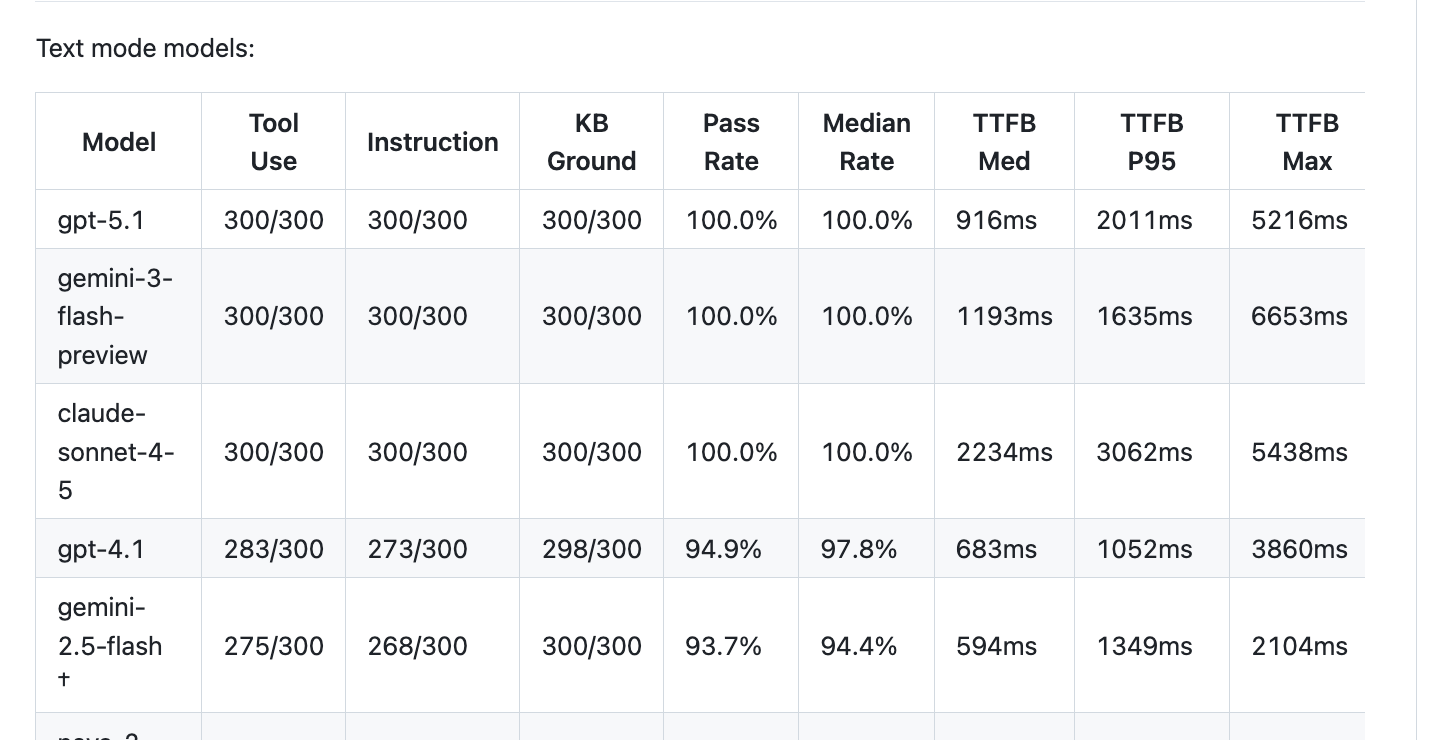The models that score 100% on this benchmark are too slow for voice agents. Natural conversation requires voice-to-voice response times under 1,500ms. This translates to about ~700ms TTFT for text-mode LLMs used in a transcription -> LLM -> voice harness.