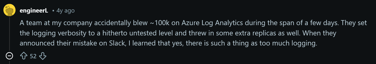 The hardest part of logging is dialing verbosity to the right level. Too much, and you balloon costs, slow down systems, and bury engineers in noise; too little, and there's nothing useful to debug with. Verbose logs have their place, but they should be scoped, short-lived, and never treated as the default.