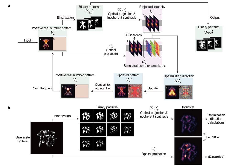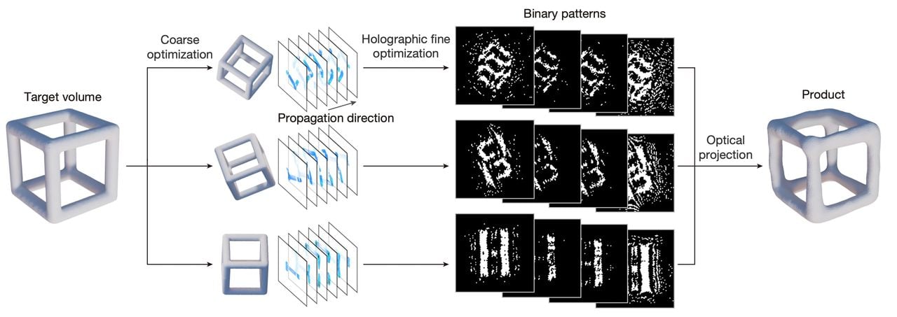 Rather than relying on partially coherent illumination, they use a coherent 405 nm laser and treat the projections holographically. Because a DMD is amplitude only, the phase engineering happens in software: an iterative wave optics model optimizes binary patterns for many angles, accounting for refraction at the air resin interface and the resin’s exposure thresholds.