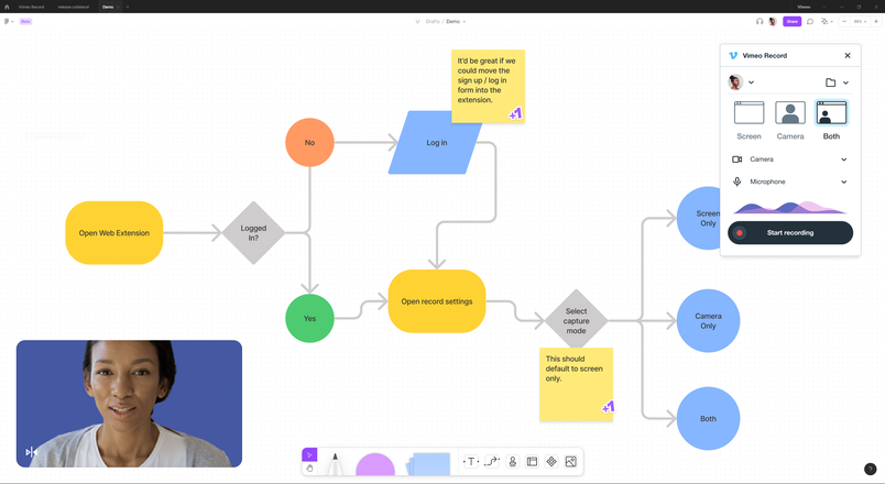 While widgets are made for collaboration, plugins help you express your ideas out, faster. With over 40 plugins available today, what you can create in FigJam is limitless. For example, Vimeo is building a new Vimeo Record plugin, where you can record screen captures and your thoughts directly in a file. This is great for sharing context with your team across time zones or voicing over a product walkthrough.