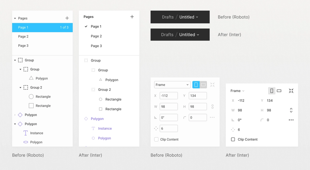 Rasmus Andersson came up with the idea for Inter in his work on Figma. We'd used Roboto (designed by Christian Robertson for Google) as our main font for years, and we were running up against its limitations. It was originally built to work as both a display typeface (for things like titles) and text typeface (for longer blocks like paragraphs). But it was difficult to read Roboto when it was small (small text makes up much of the typography in Figma's UI).