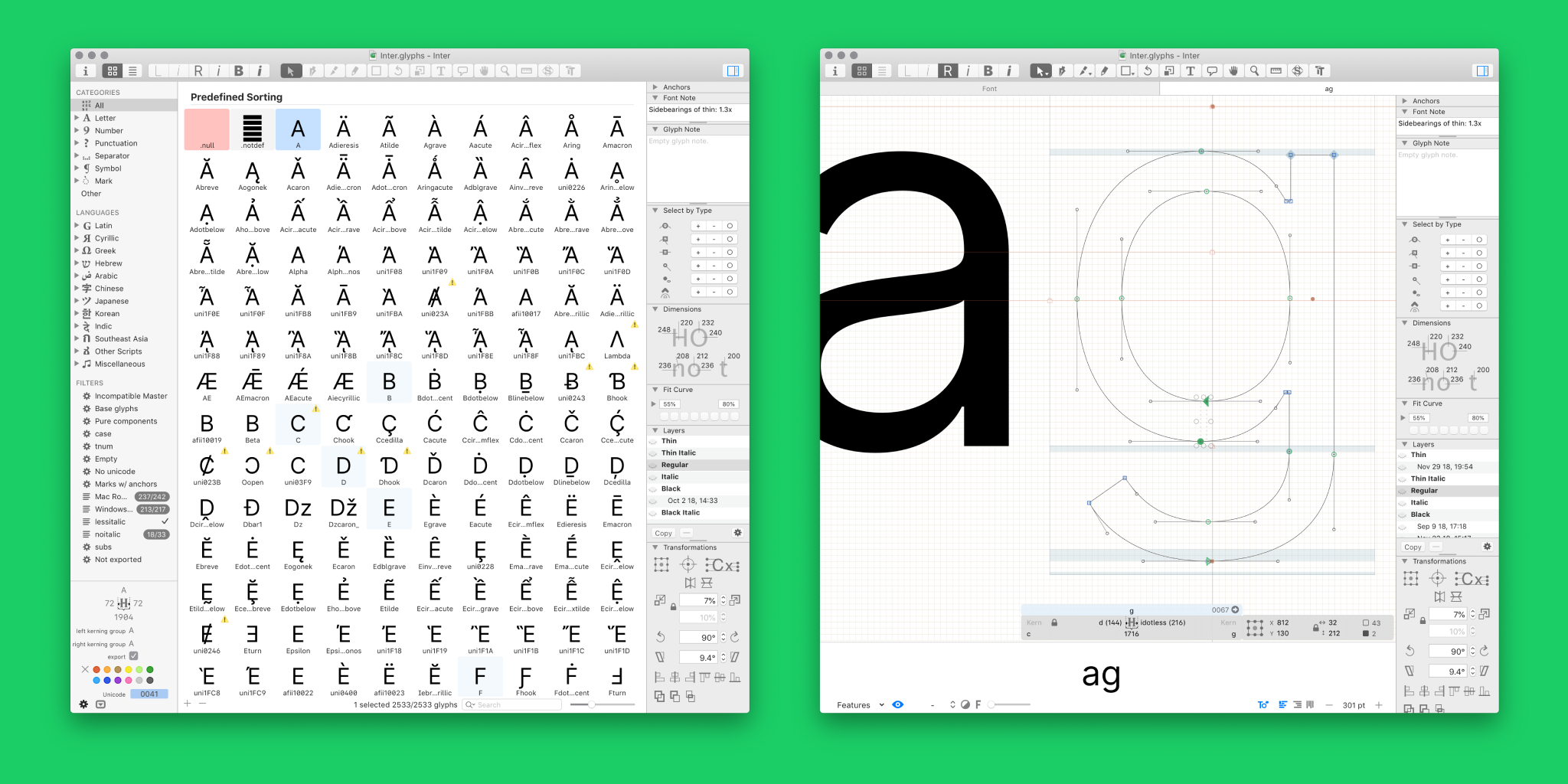 There's a lot of composition involved, so components is a very common workflow. In these font tools, you say: "This thing with the dots over it composes the A and the dots glyphs." Now, in the future when I make an adjustment to my A, it adjusts all of those characters that are based on A automatically. You can create these very efficient ways of iterating on the design through use of components.