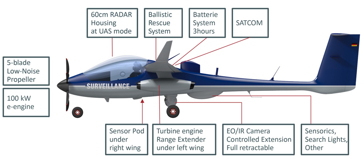 - Elektro-Hybrid-Antrieb: Ein hochmoderner und leichter Wankelmotor bietet optional extreme Reichweite und lange Flugdauer.