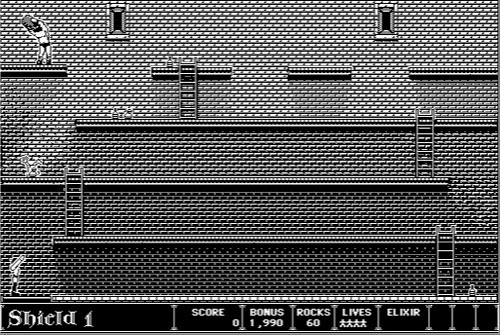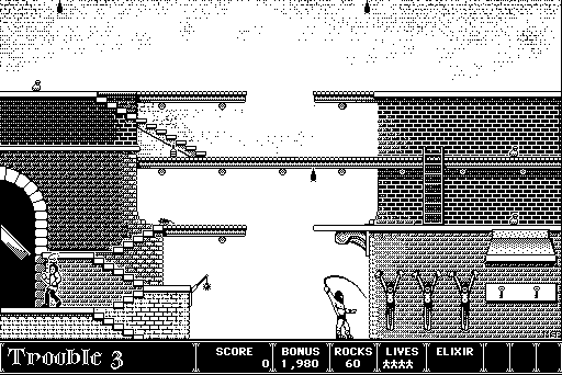 Their vision for the game was that of a living, interactive animation. The story, itself reminiscent of a Saturday morning cartoon, was serviced by the typical hallmarks of a good cartoon: smooth, sharp, and completely flicker-free animation (thanks to Gay's assembly code and a documented but unsupported hardware hack); moody and detailed backgrounds; and a clumsy idiot of a hero. The main character, unnamed in the game but dubbed Prince Duncan by the blurb on the back of the box, could run, jump, and throw rocks easily enough, but he was also clumsier than Shaggy from Scooby Doo. If he could manage to avoid being bitten by a bat, a rat, or a crow, or being taken out by a crossbow arrow or some other baddie, he'd still be liable to die in comical fashion, courtesy of an evil half-step up or down.