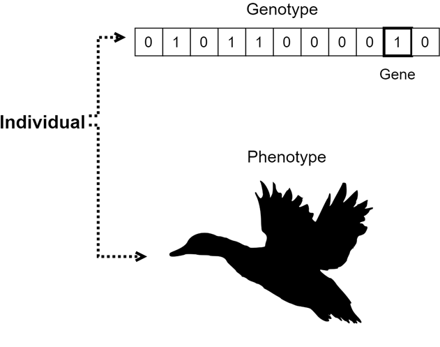 Genotype (chromosome) - represents the genetic encoding of the parameters of the individual. This is the representation used for evolutionary operations. For example, in genetic algorithms, a binary string is a commonly used encoding. One of the benefits of such an encoding is the ability to use the standard, well-established genetic operators with it.