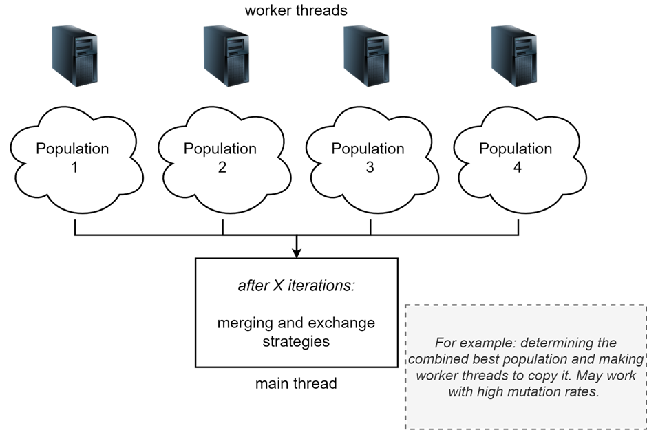 Parallel populations: another strategy involves running semi-independent EA processes, each with its own distinct population. After several epochs, these populations can undergo merging, synchronization, or interchange of individuals among them. This method is often known as the “island model”. It allows for a diversified genetic pool across different populations.