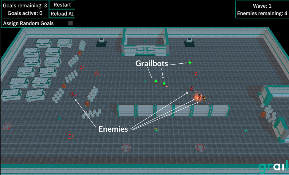Grailbots showcases the Utility AI technique implemented in Grail. This demo features two teams controlled by AI: