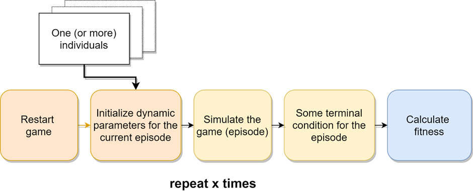 Save and load of the EA state: implementing the functionality to fully serialize the current state of a running EA algorithm, including the current population, enables the process to be split across multiple sessions. This is particularly useful in scenarios, where computing resources are not always fully available or when human players are involved in the loop. For example, if human players are required to play the game, some machines can be allocated for this purpose. Whenever a player is ready to play, the system will load the current state of the EA. The player may then advance the progress of the algorithm by some steps, depending on the number of games played.