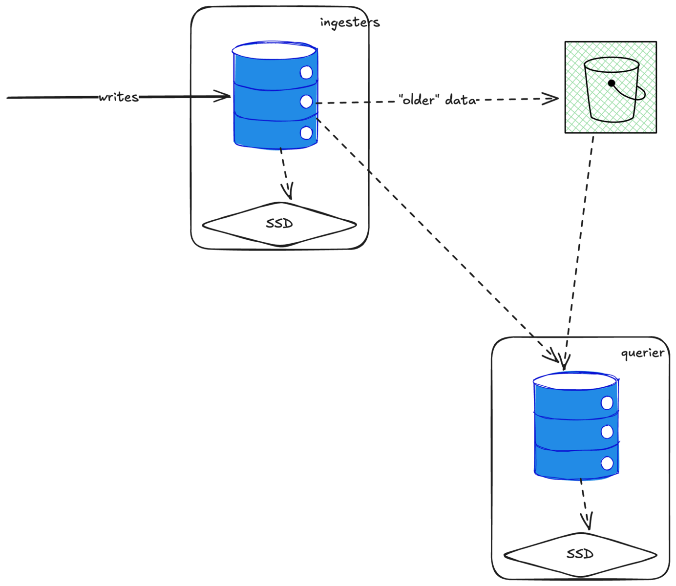 This got me really excited because it's similar to Mimir's architecture. In Mimir, we have ingesters that store 2-3 hours of recent data in memory, then flush to S3. We have separate store gateways that query S3 for older data. When a query comes in, the querier looks at the time range and routes to ingesters (recent data) or store gateways (older data), or both. It works great because rebalancing only affects a few hours of data.