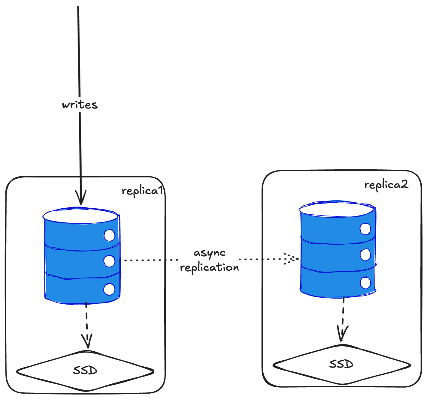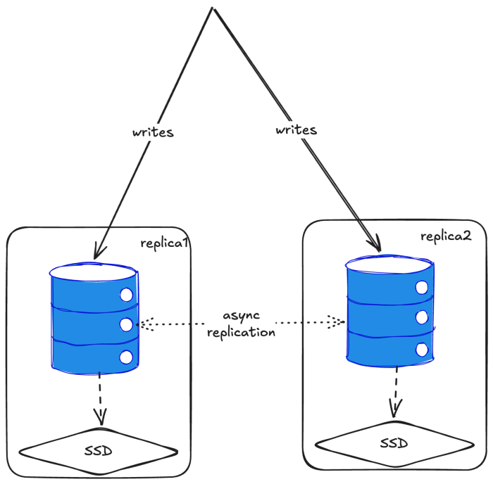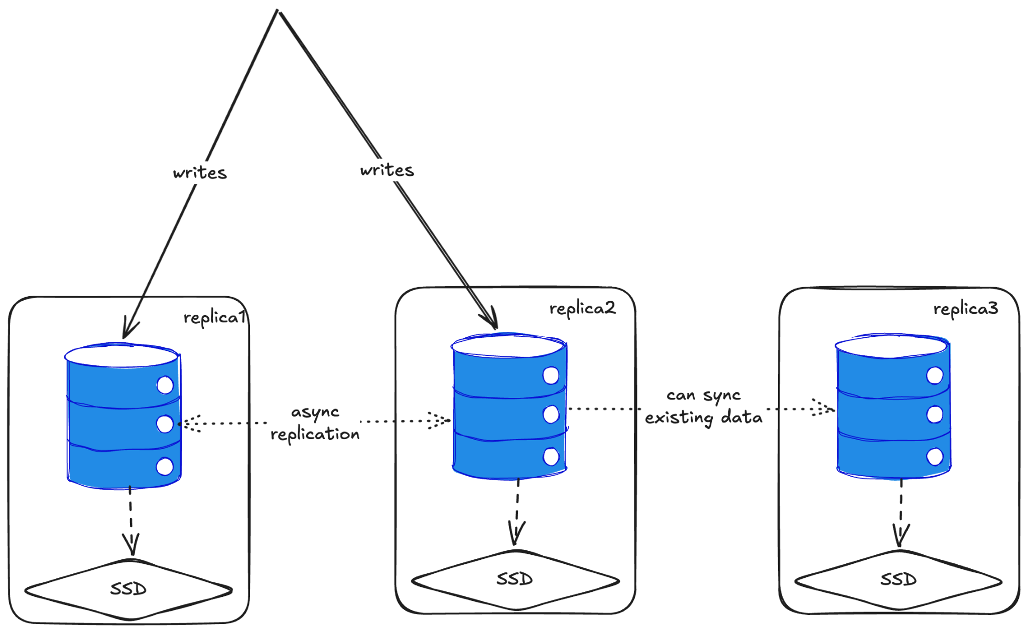 Here's how replication works: you tell ClickHouse about the replicas, and whenever you write to one node, it asynchronously replicates to all replicas. You can also write to multiple replicas simultaneously, and they'll sync between themselves.