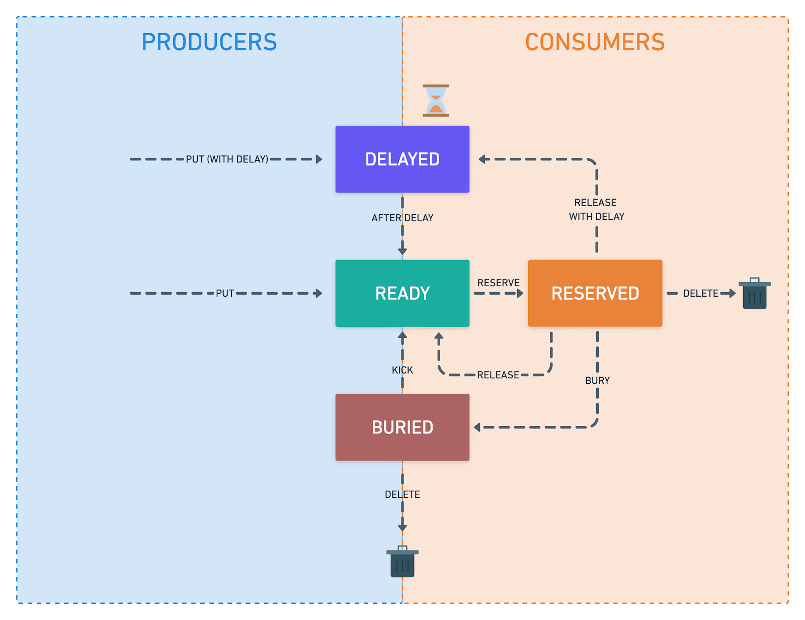 Unless they are already processing a message, most of the time your consumers will be watching a tube waiting for a message to become ready, which means it is available for processing. The consumer will then reserve the job, which stops any other consumers in the group from processing the same message. Assuming the message is processed successfully, it can then be deleted and removed from the system, which is the process most messages follow (put – – – > READY – – – > reserve – – – > RESERVED – – – > delete).