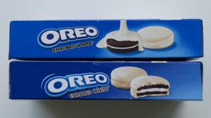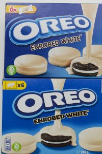When looking a bit closer, I was in for a second surprise: I had bought two varieties of Oreo in the Belgian shop. Next to the regular one also the ‘Enrobed White’. And guess what: not only did these have a different ‘brand color’, also the logo had changed! I didn’t notice that while shopping! I did take some time – at least half a minute – before I noticed it, it’s a subtle change.