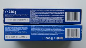 After finally noticing that the logo had changed, I went to another supermarket close to my home (Jumbo) and bought multiple other Oreo packages. And there I noticed that the ‘Enrobed white’ logo differed from the package in the first supermarket! Plus the fact that the different versions of the logo were used next to each other. And it’s not just the logo that went from a ‘3D’ version to a ‘flat’ version. Also, the signature color in the logo went from a medium blue to a dark blue. When I returned home I checked the color difference with my Nix Spectro 2: over 10 dE00. That’s a lot more than the maximum tolerances many brand owners demand because they believe they would lose sales with higher deviations.