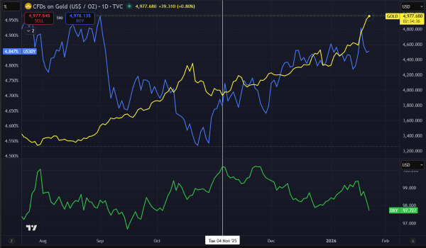 It’s quite simple, actually. Anyone without an economics degree can fundamentally grasp the nature of supply and demand, and when the president of the United States is declaring war on the people who lend him money, the demand to lend him more money in the future is going to wane. You can see this very clearly on the charts, all you have to do is draw a vertical line on election day, and then pay attention to the directions that these three lines travel in (blue is the 30-year U.S. Treasury Bond yield, gold is gold, and green is the dollar).