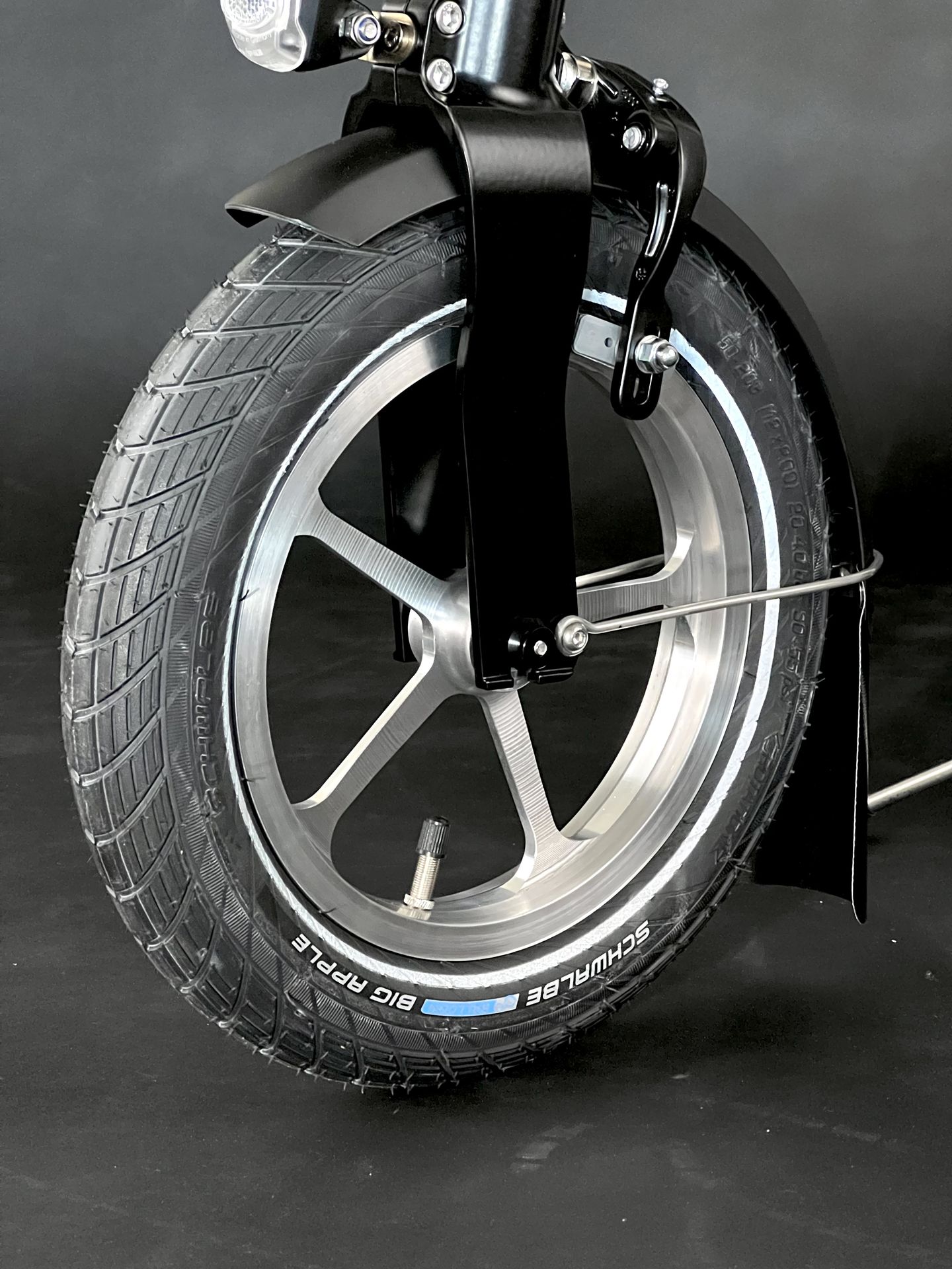 16-inch and 20-inch wheels do offer a slight advantage in terms of comfort, but this clearly comes at the expense of manoeuvrability – which is particularly important in busy cities. In order to achieve comparable comfort with 12-inch wheels, we deliberately chose wide tyres with a width of 50 mm, so that riding on uneven paths is just as comfortable as with larger wheels.