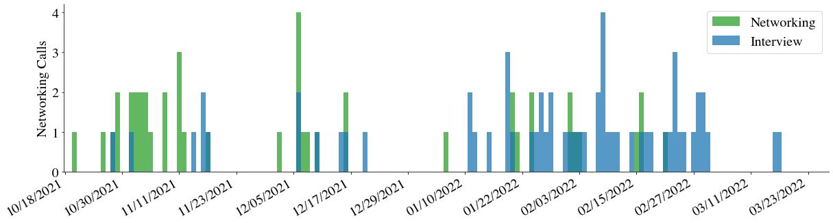 The result was plus or minus 53 one-off interviews, 46 networking calls, 6 (virtual) on-site interviews, and 4 offers from 30 companies I contacted or applied to. Here is a visualization of the timeline. I announced I was starting the process on 26 Oct. 2021, which started the influx of emails and messages. These conversations were a fantastic way to learn what is out there without the constant pressure of interviews. Some of these transitioned into early interviews, but really I had a networking phase followed by an interview phase (I was trying to interview earlier, it seemed like most companies were somewhat waiting until 2022).