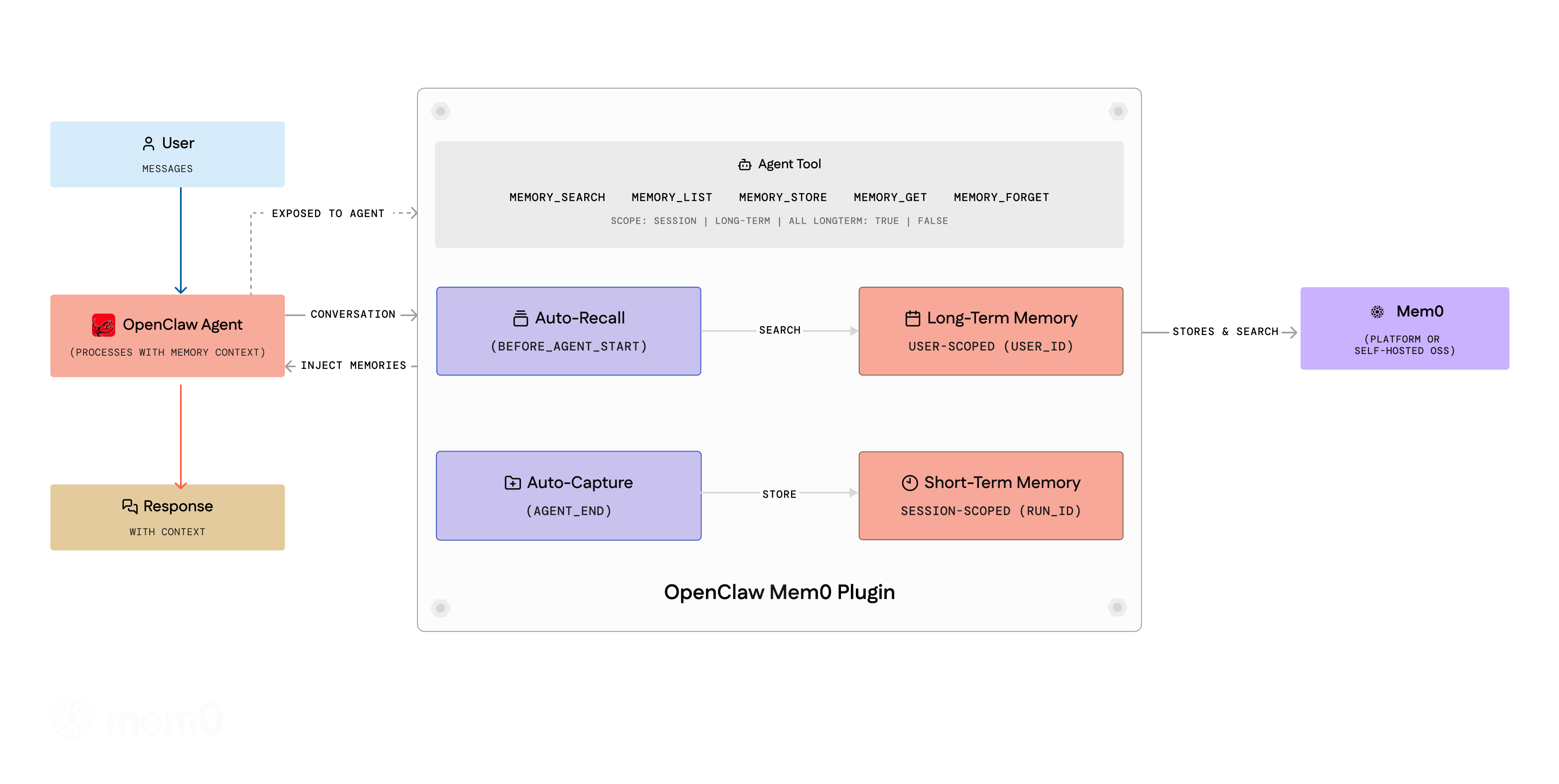 Auto-Recall — Before the agent responds, the plugin searches Mem0 for memories that match the current message and injects them into context.