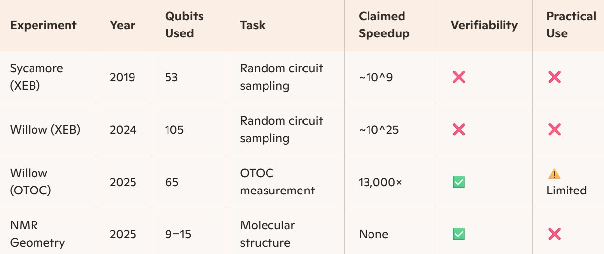 Here’s a comparison between these various experiments, Sycamore supremacy in 2019, Willow supremacy in 2024, the Willow Nature experiment and the arXiv NMR geometry experiment, both in 2025:
