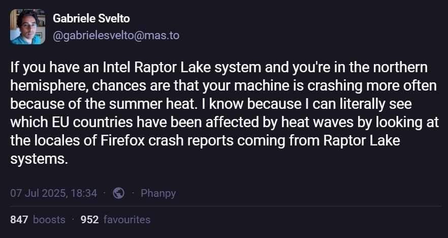 By tracking the locales of Firefox crash reports, Svelto was able to link ongoing heatwaves in Europe to crashes on Intel Raptor Lake systems. Not everyone will be affected, of course, but it’s an interesting connection to make with the data to back it up. This even led to Mozilla having to disable a crash report bot because it was “almost only” finding crashes on Raptor Lake.