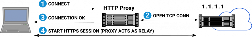 - The client starts a new HTTPS session with the target, with the proxy blindly ferrying the bytes back and forth between the client and the target (DNS resolver)