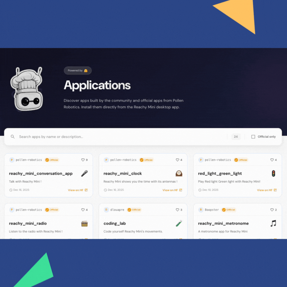 Discover and run existing Reachy Mini applications directly from Hugging Face Spaces.