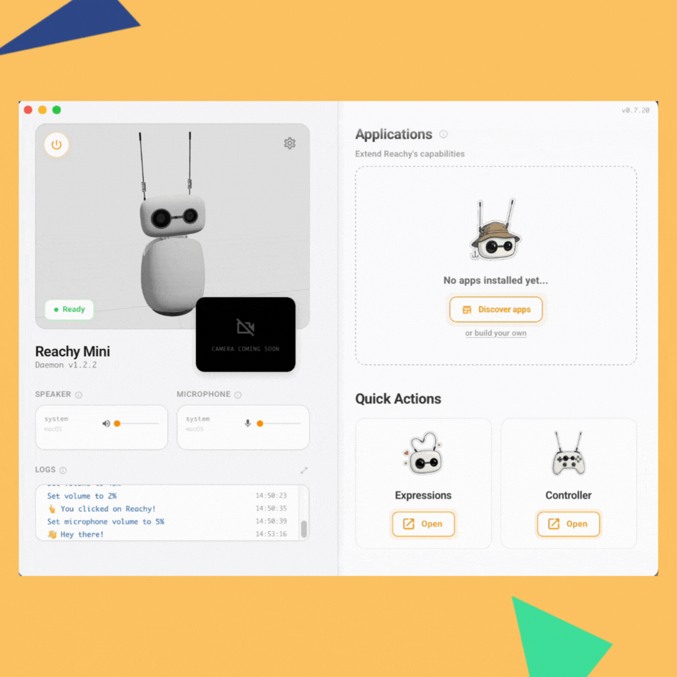Create custom applications and behaviors for Reachy Mini using open tools and APIs.