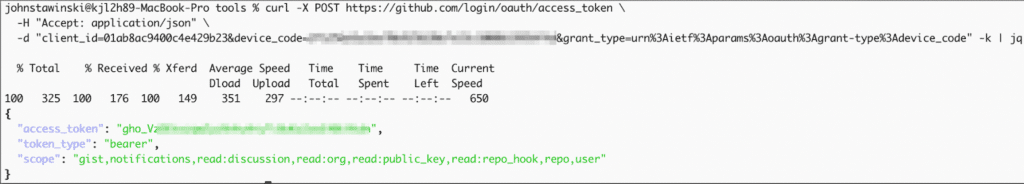 -d "client_id=01ab8ac9400c4e429b23&device_code=be9<code_from_earlier>&&grant_type=urn%3Aietf%3Aparams%3Aoauth%3Agrant-type%3Adevice_code" -k | jq