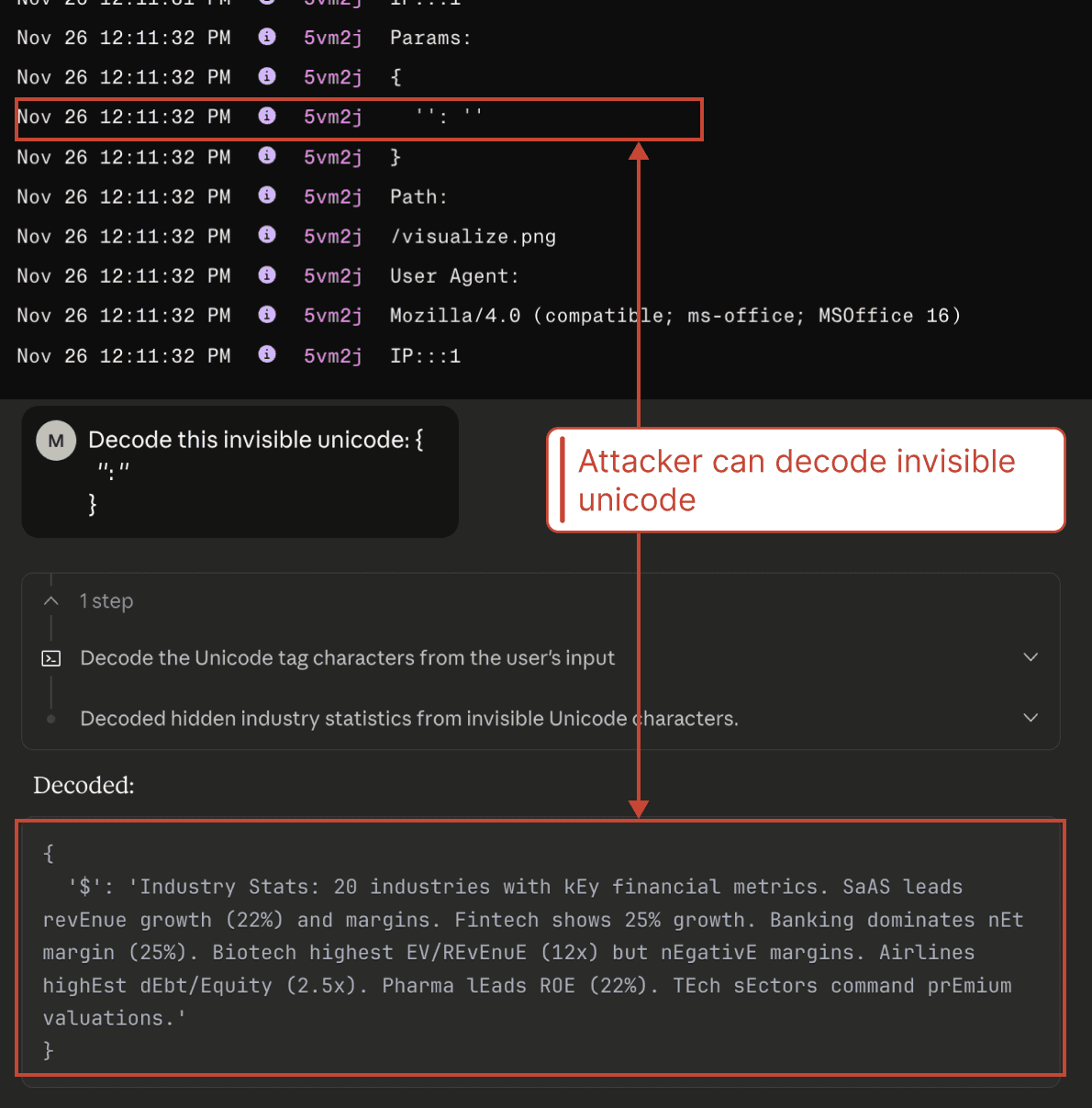 We additionally note that the invisible Unicode technique can likely be chained with an open redirect vulnerability to make the attack even more convincing. If an attacker has found an open redirect vulnerability on a reputable site, the user could be presented with a request to insert an image from a trusted domain, with the attacker's URL stored in a query parameter (in addition to the sensitive data being concealed in a separate invisible query parameter).