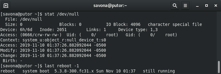 The /dev/null file is a pseudo-device file generated at boot. It has no size (0 bytes), takes up 0 blocks on disk, has read/write permissions for all users. The screenshot below shows that the file and last system reboot have the same date and time.