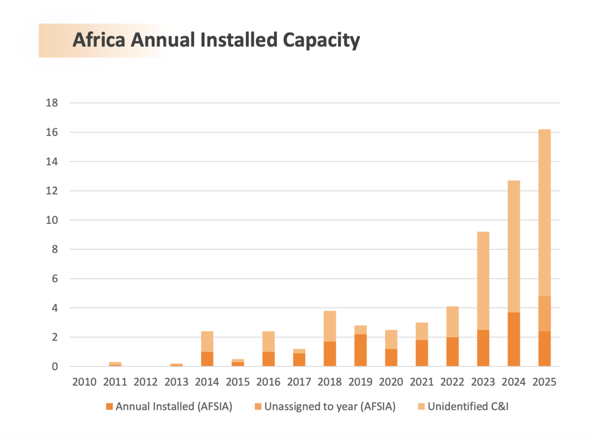 The association expects that the currently-unidentified solar in Africa consists of C&I and residential installations, due to the official documentation of utility-scale projects, consistent reporting of SHS and PUE systems and minigrids most often being government-led programs.